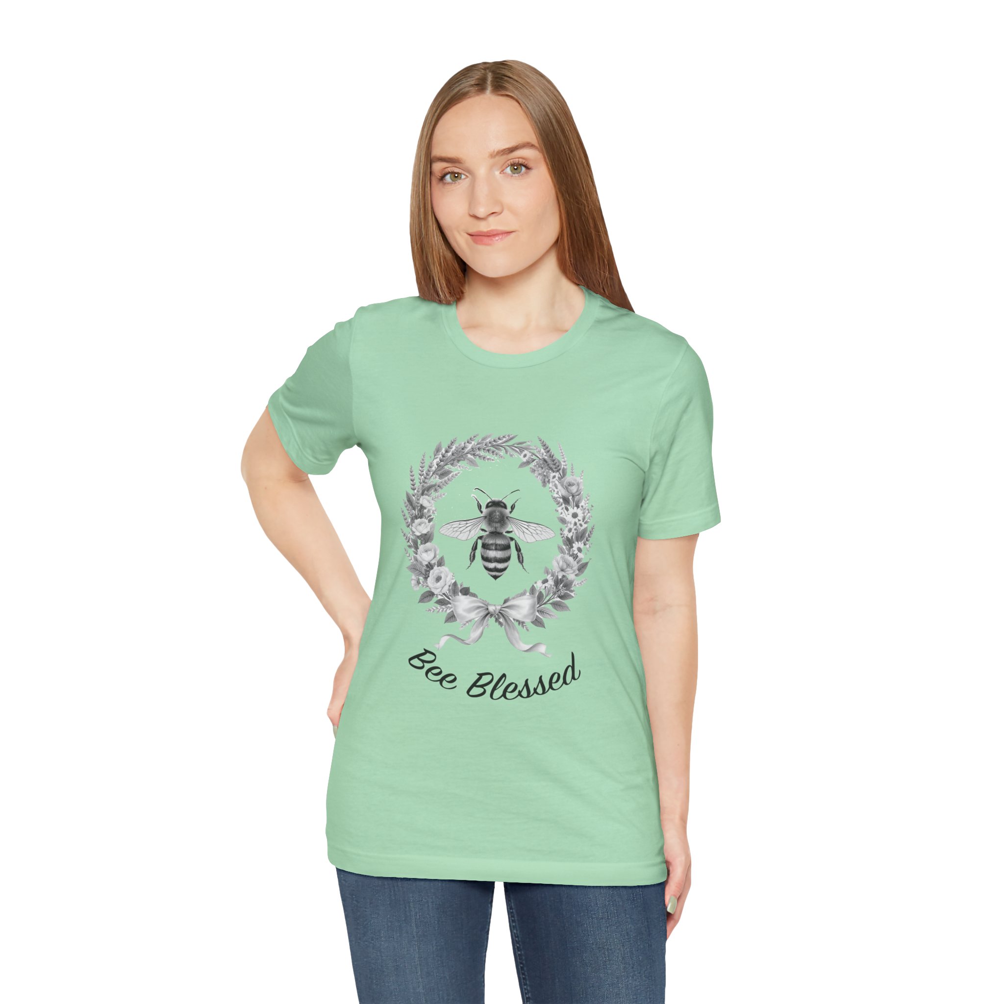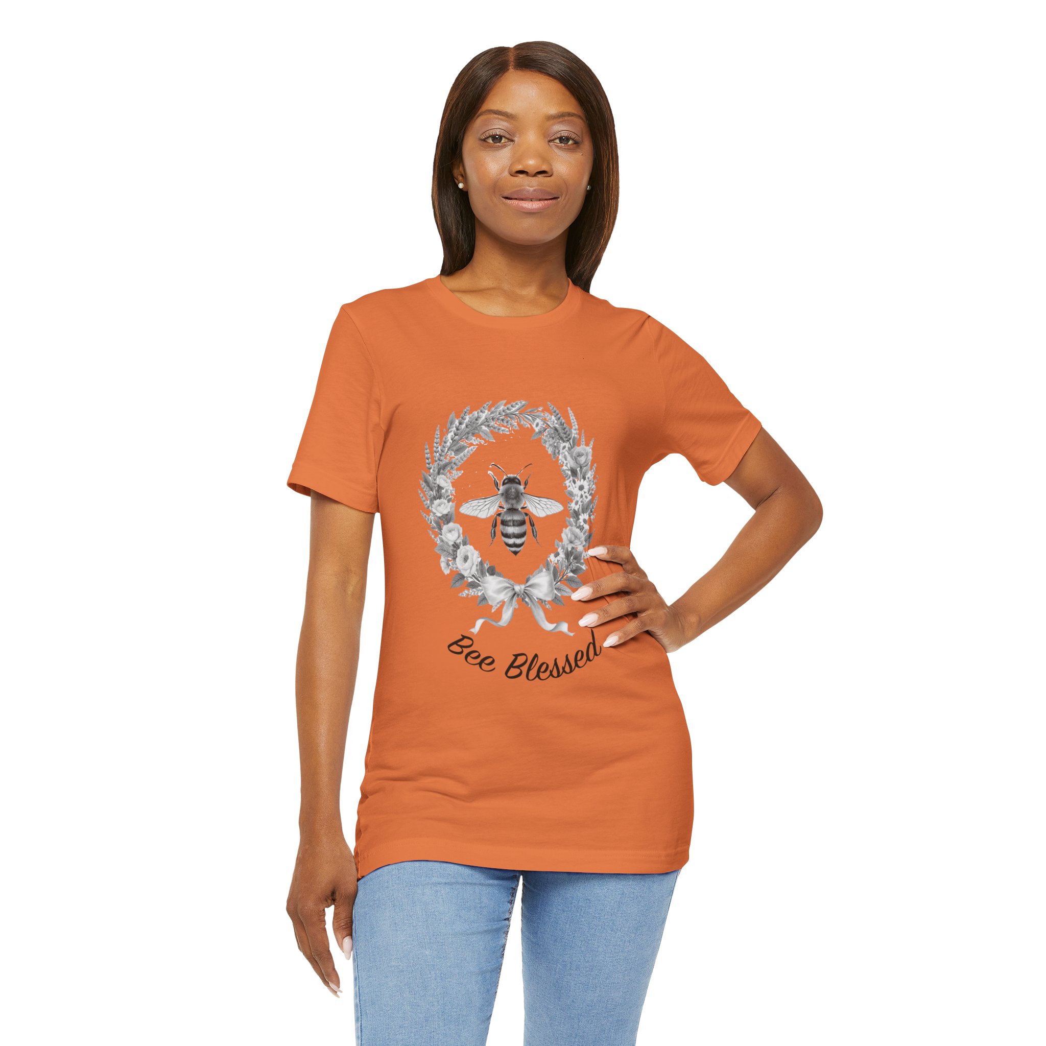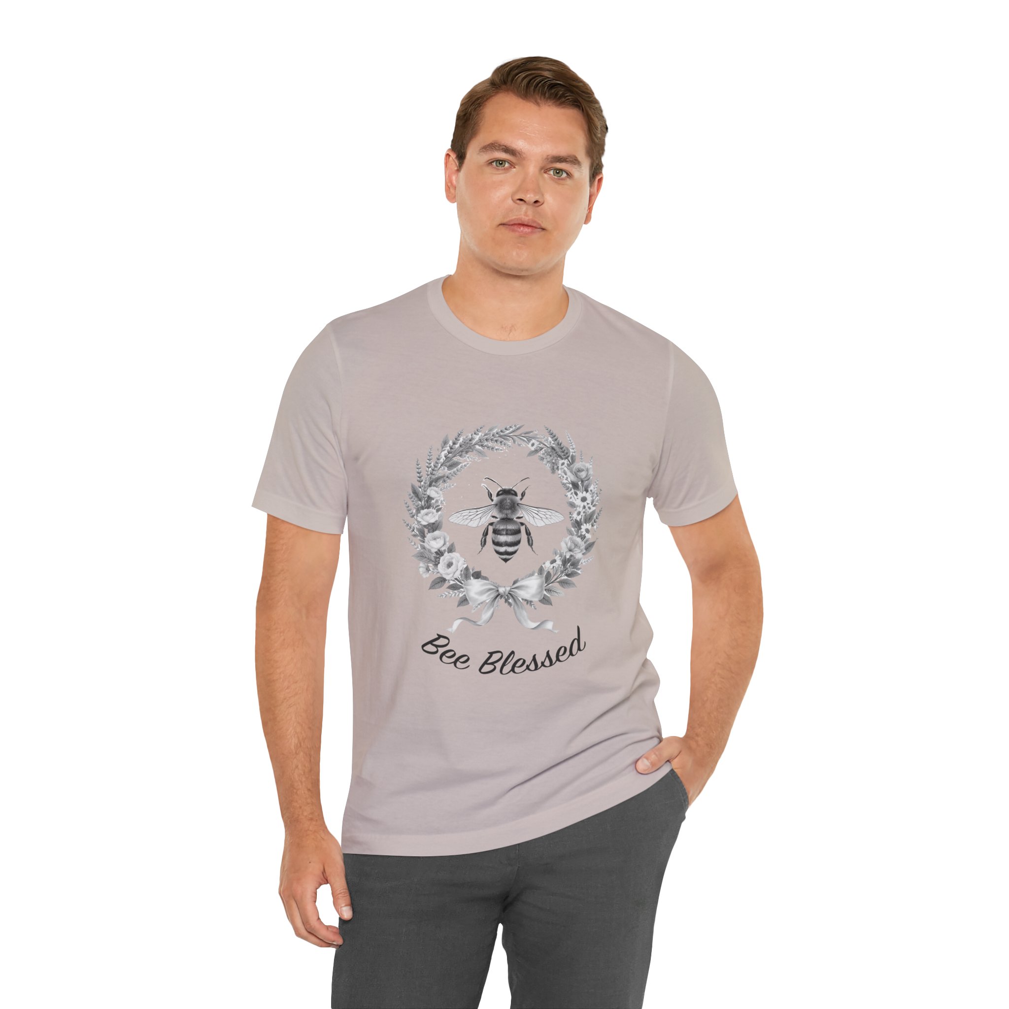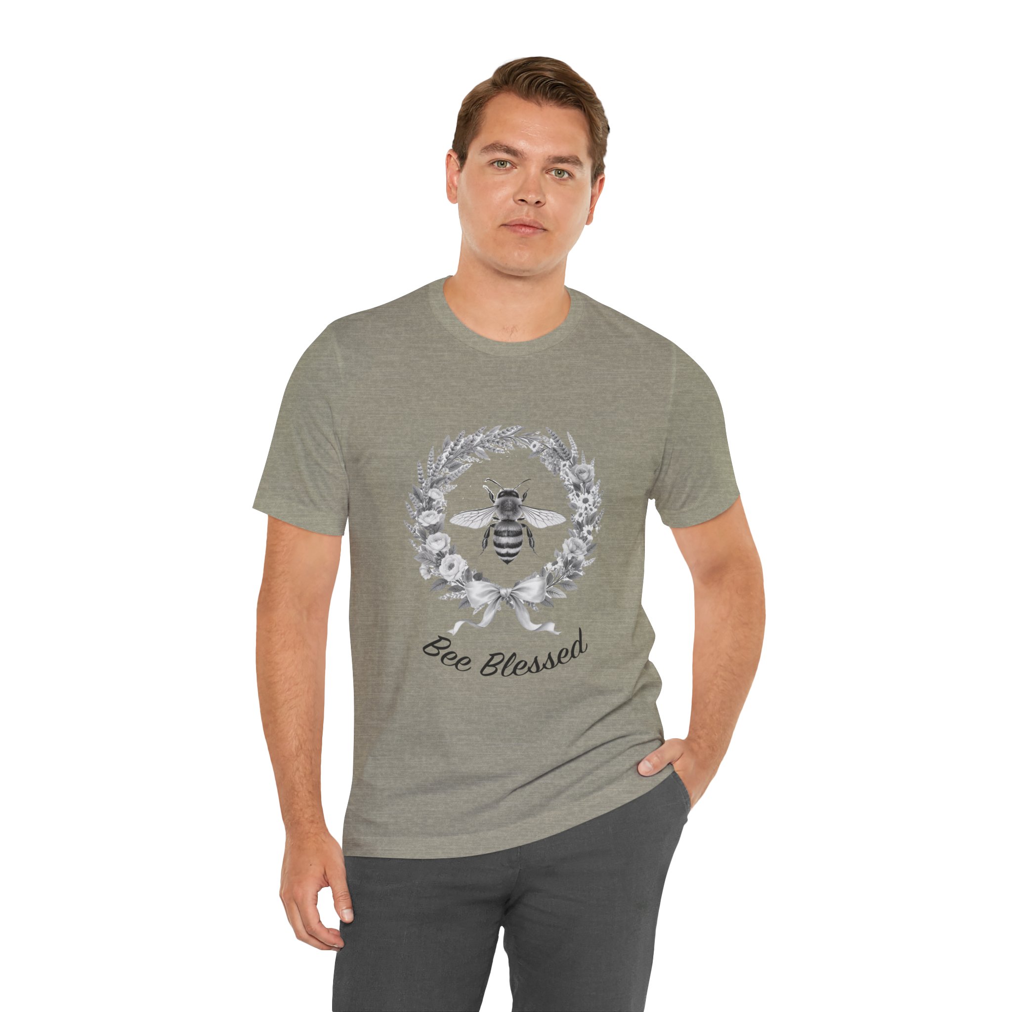 This lightweight cotton tee carries a quiet, nature-minded message: a delicate wreath of leaves frames a detailed honeybee, with the hand-lettered sentiment “Bee Blessed” beneath. Soft, breathable Airlume combed and ring-spun cotton keeps the shirt airy for long days outdoors or relaxed mornings at home. The neutral monochrome art reads like a vintage sketch—subtle, organic, and a little nostalgic—so it layers easily under sweaters or stands on its own with jeans. Wear it on garden mornings, farmers’ market runs, or while tending a windowbox; it feels like a small ritual of gratitude and gentle stewardship every time you put it on.