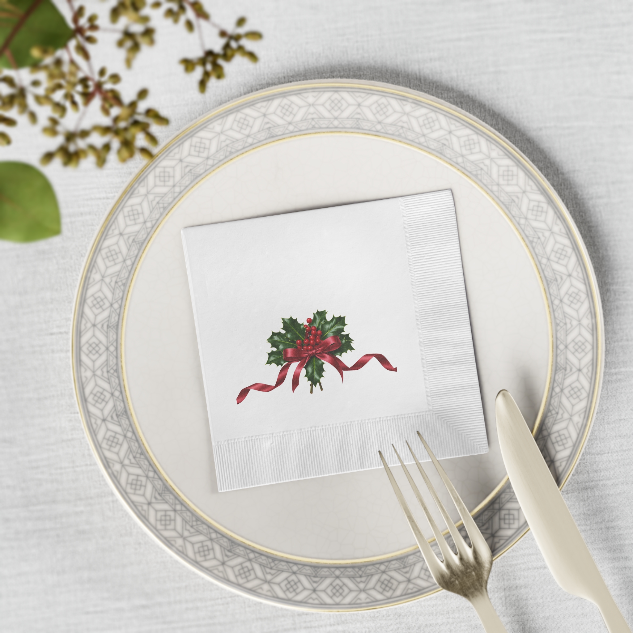 Holly Berries with Red Ribbon Napkins | Christmas Holiday Napkins