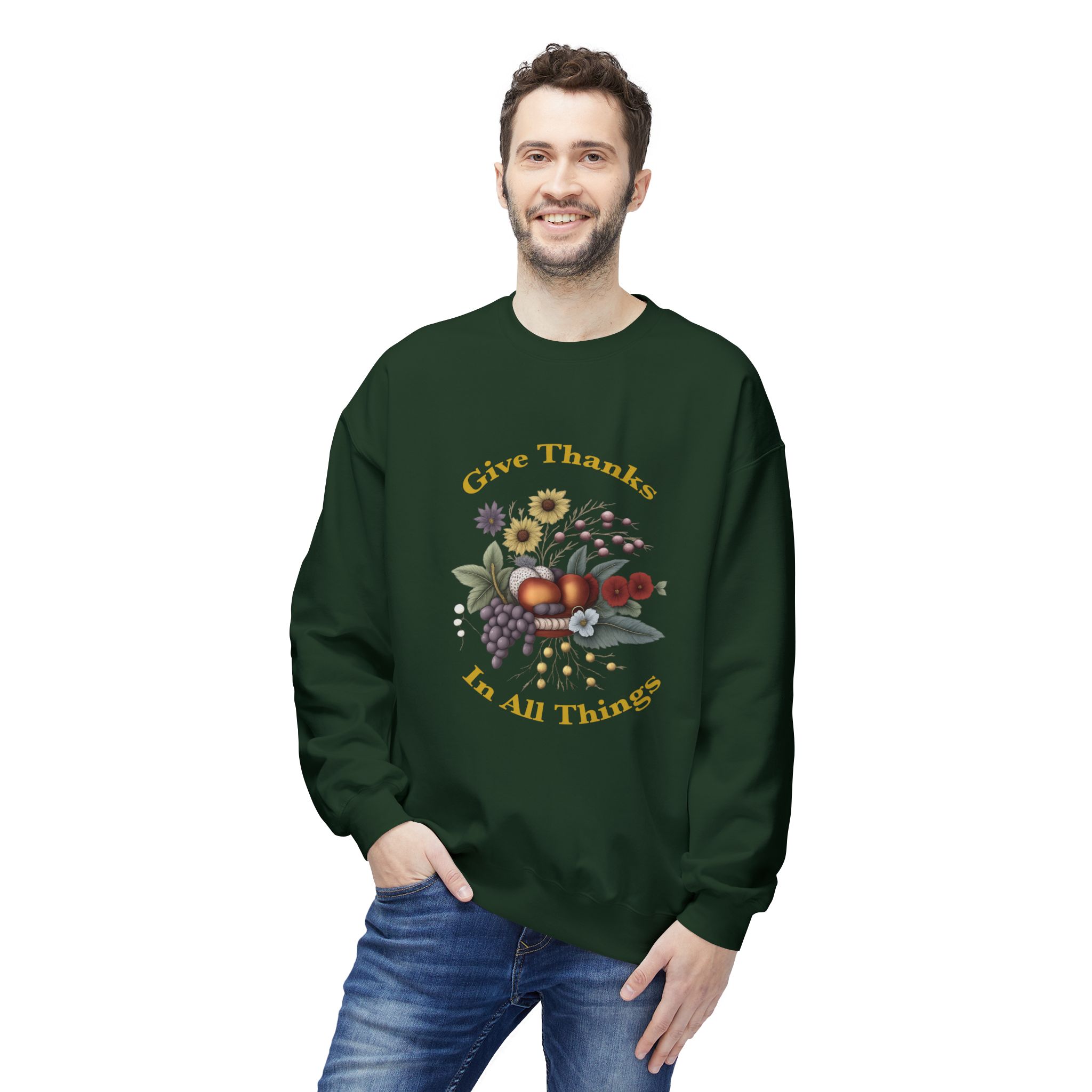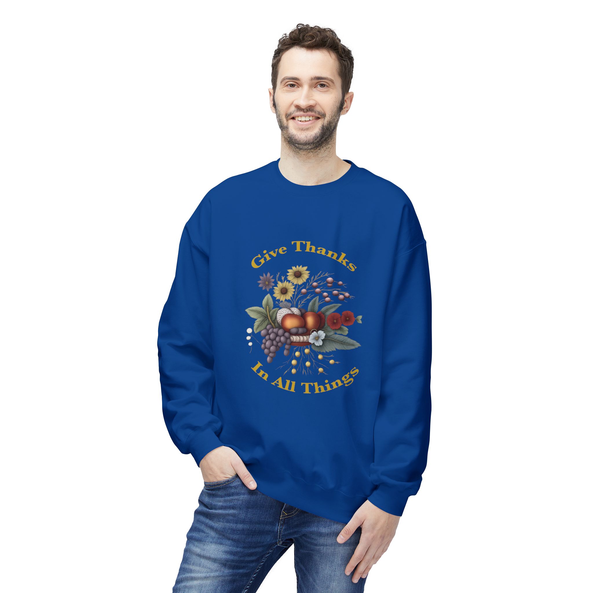 Stay cozy in style with the Gildan® SF000 unisex sweatshirt. Crafted from a blend of 80% ring spun cotton and 20% polyester, with a brushed interior and 100% ring spun cotton face, it offers unmatched comfort and durability. Featuring a dropped shoulder design for a relaxed fit, this sweatshirt is not only stylish but also eco-conscious. Partnering with Better Cotton to enhance cotton farming worldwide, and made with OEKO-TEX certified low-impact dyes, you can feel good and look even better. Give Thanks In All Things message Disclaimer: – Due to the fabric properties, the White color variant may appear off-white rather than bright white. .: 80% ring-spun cotton, 20% polyester (fiber content varies for different colors) .: Medium-heavy fabric (8.4 oz/yd² (285 g/m²)) .: Classic fit .: Tear-away label