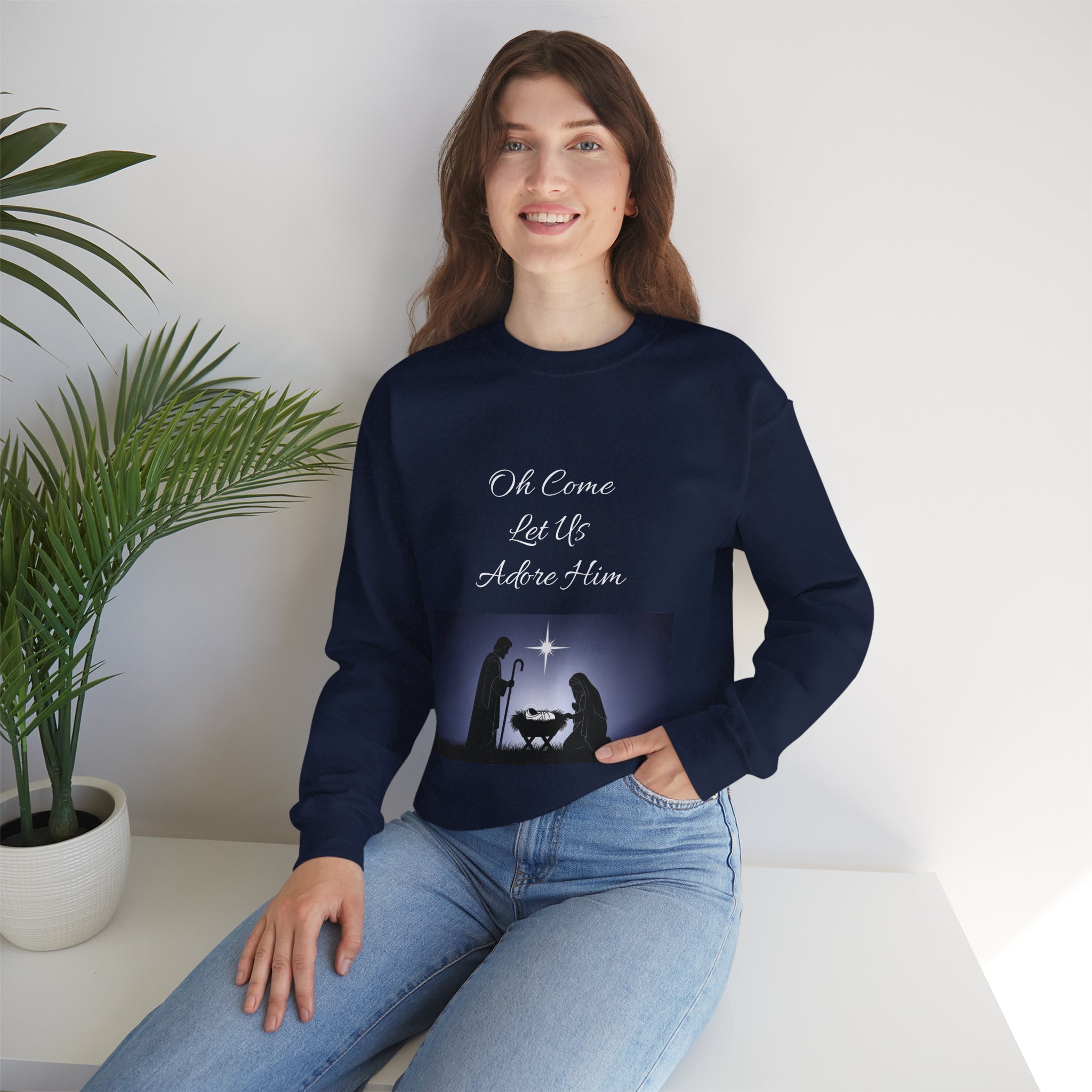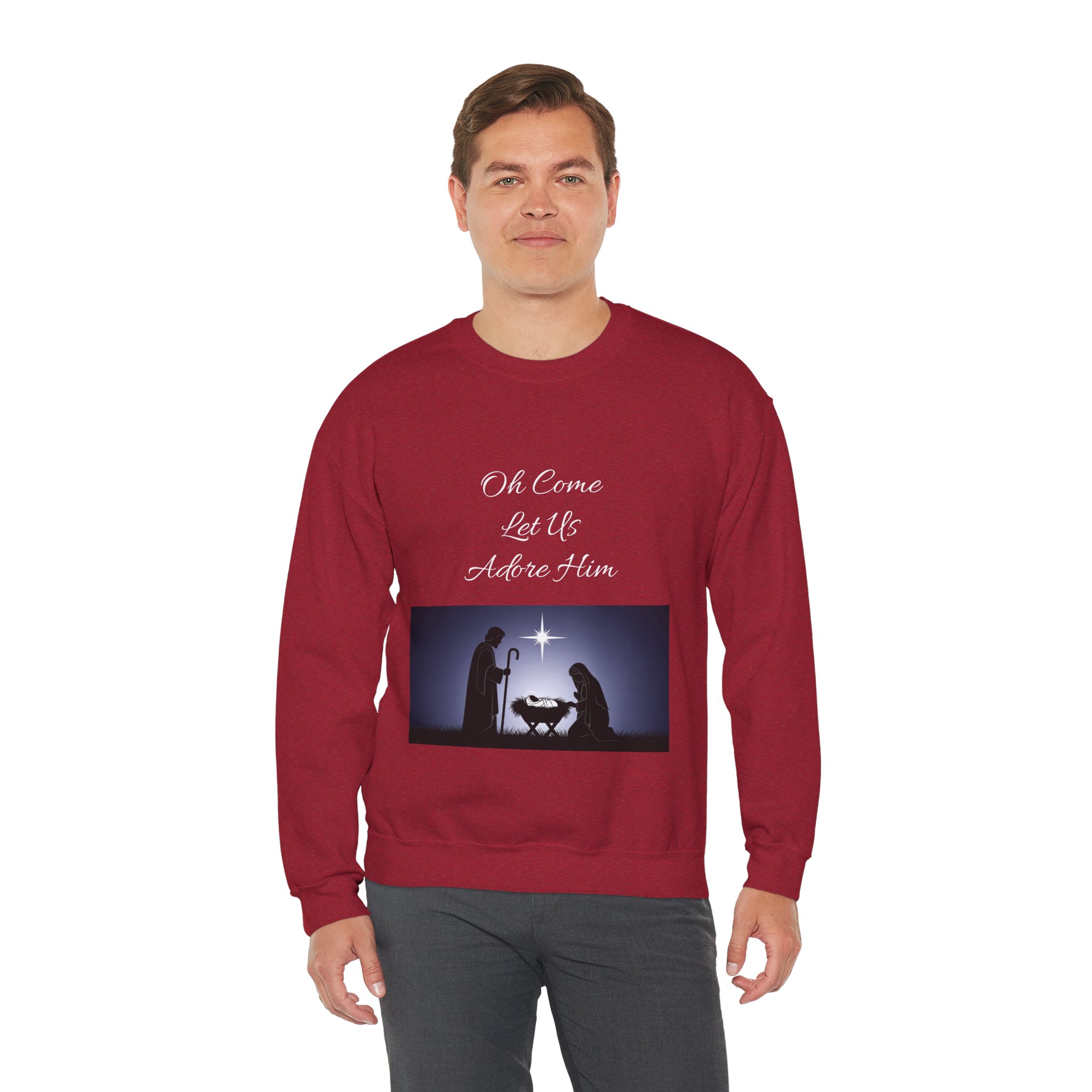 Soft, warm, and quietly reverent — this crewneck carries a simple nativity scene across the front, rendered in shadowed silhouettes beneath a single guiding star. The medium-heavy cotton-poly blend feels substantial without being stiff, with a classic cut that layers easily over shirts or under coats during chilly evenings. Wear it to carol nights, candlelight services, or slow mornings at home; the understated design keeps the focus on the season’s calm and meaning. Thoughtful details — tear-away label, reinforced stitching, and options for small embroidered accents — make this sweatshirt both comfortable and built to last. Product features – 50/50 cotton-poly medium-heavy (8.0 oz/yd²) fabric for warmth and durability – Classic crew neckline with ribbed collar and double-needle stitching for long-lasting shape – Tubular construction (no side seams) for clean look and reduced fabric waste – Embroidered decoration options (left/center chest or wrists) and DTG/DTF print methods available – OEKO-TEX dyes, ethically grown US cotton, and compliance with safety standards Care instructions – Machine wash: cold (max 30C or 90F) – Non-chlorine: bleach as needed – Tumble dry: low heat – Do not iron – Do not dryclean