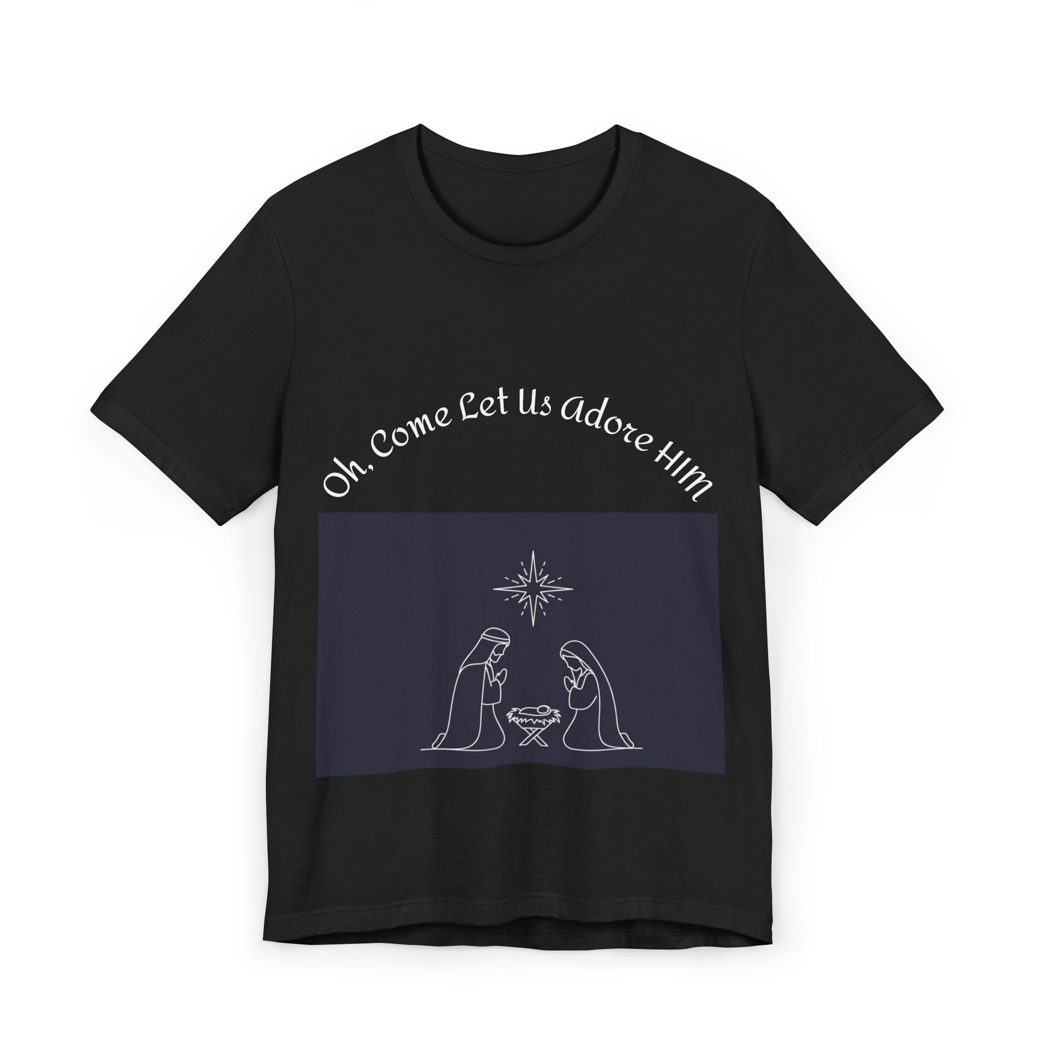 A soft, lightweight tee that carries a quiet, reverent message. The simple line-art nativity scene and gentle lettering sit low on the chest, inviting a calm moment of reflection. Wear it to candlelight services, family gatherings, or slow winter mornings — it layers easily under sweaters or over long sleeves and moves with you whether you’re singing carols or sipping cocoa by the tree. The breathable fabric and relaxed retail fit keep things comfortable all evening, while the crew neckline and neat silhouette keep the look timeless and respectful. Product features – 100% combed, ring-spun cotton (color-dependent blends for heathers/neon) – Super lightweight, highly breathable fabric (142–146 g/m²) – Retail fit with crew neckline — great for layering – Ribbed knit collar and shoulder tape for shape retention – Tear-away label (note: fulfillment may apply generic neck print) Care instructions – Machine wash: cold (max 30C or 90F) – Non-chlorine: bleach as needed – Tumble dry: low heat – Iron, steam or dry: low heat – Do not dryclean