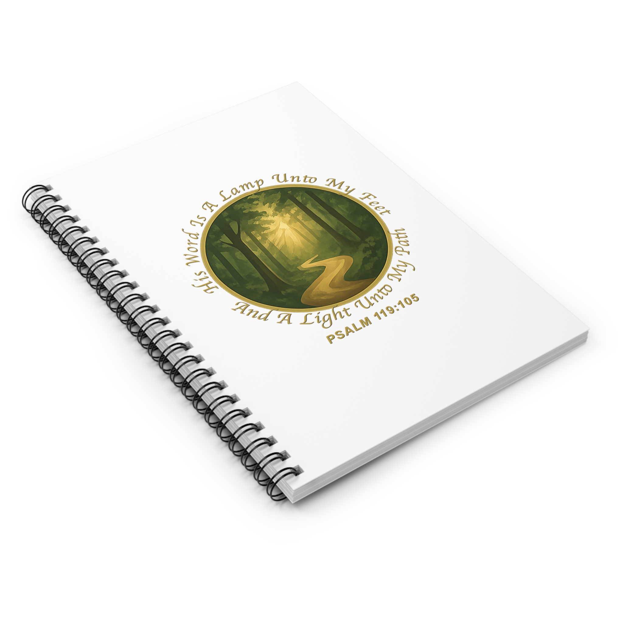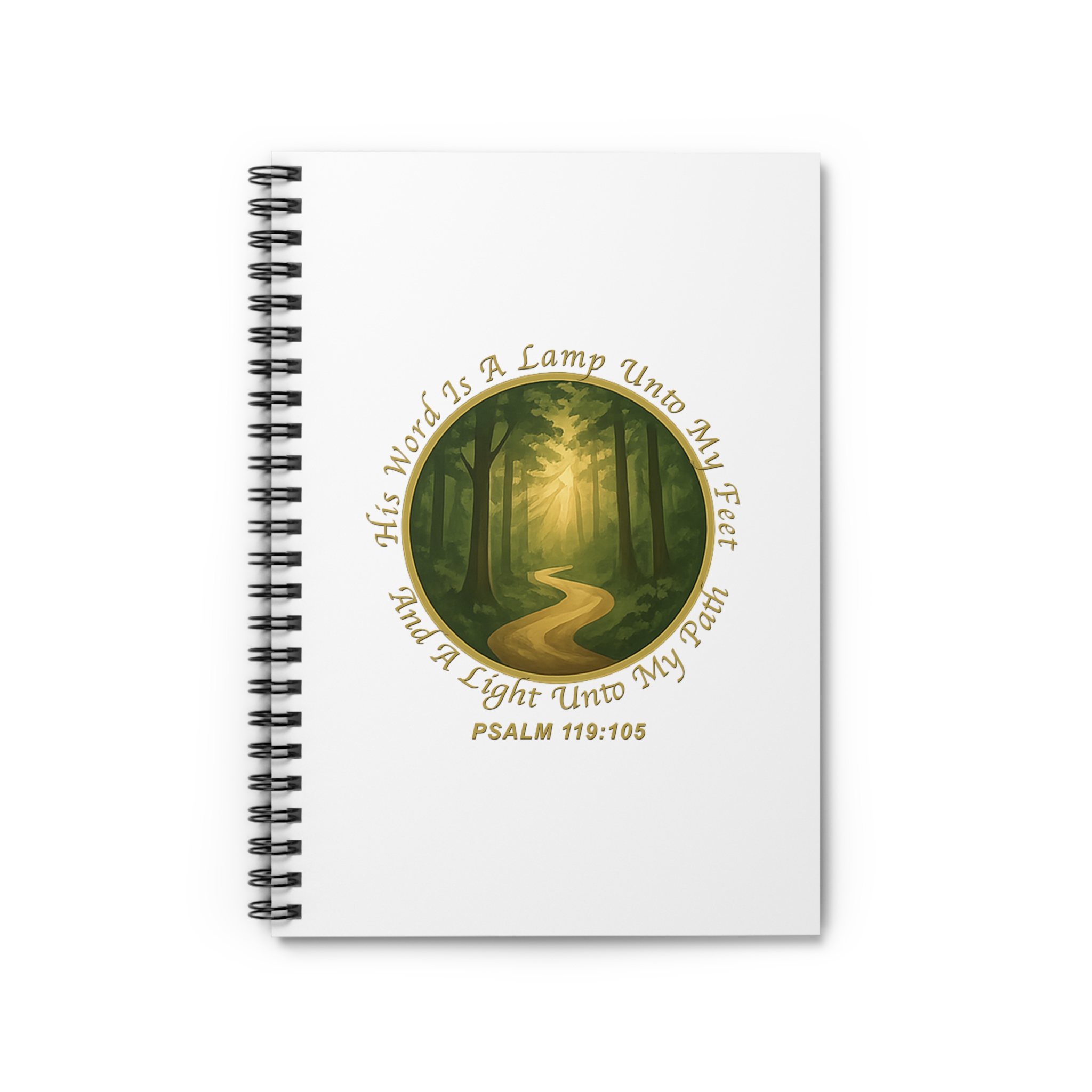 A compact, ruled spiral notebook that feels like a quiet walk through the woods. The front features a warm, circular illustration of a sunlit forest path with the comforting verse “His Word is a lamp unto my feet and a light unto my path — Psalm 119:105.” Inside are smooth 90gsm lined pages for journaling, sermon notes, prayer lists, or daily reflections. The metal spiral binding lies flat for easy writing and allows pages to be removed cleanly. A built-in document pocket in the back cover keeps loose papers, bookmarks, or small keepsakes tucked away. Lightweight and pocketable at 6″ x 8″, it slips into a tote or Bible cover and invites quiet moments of writing and remembrance.