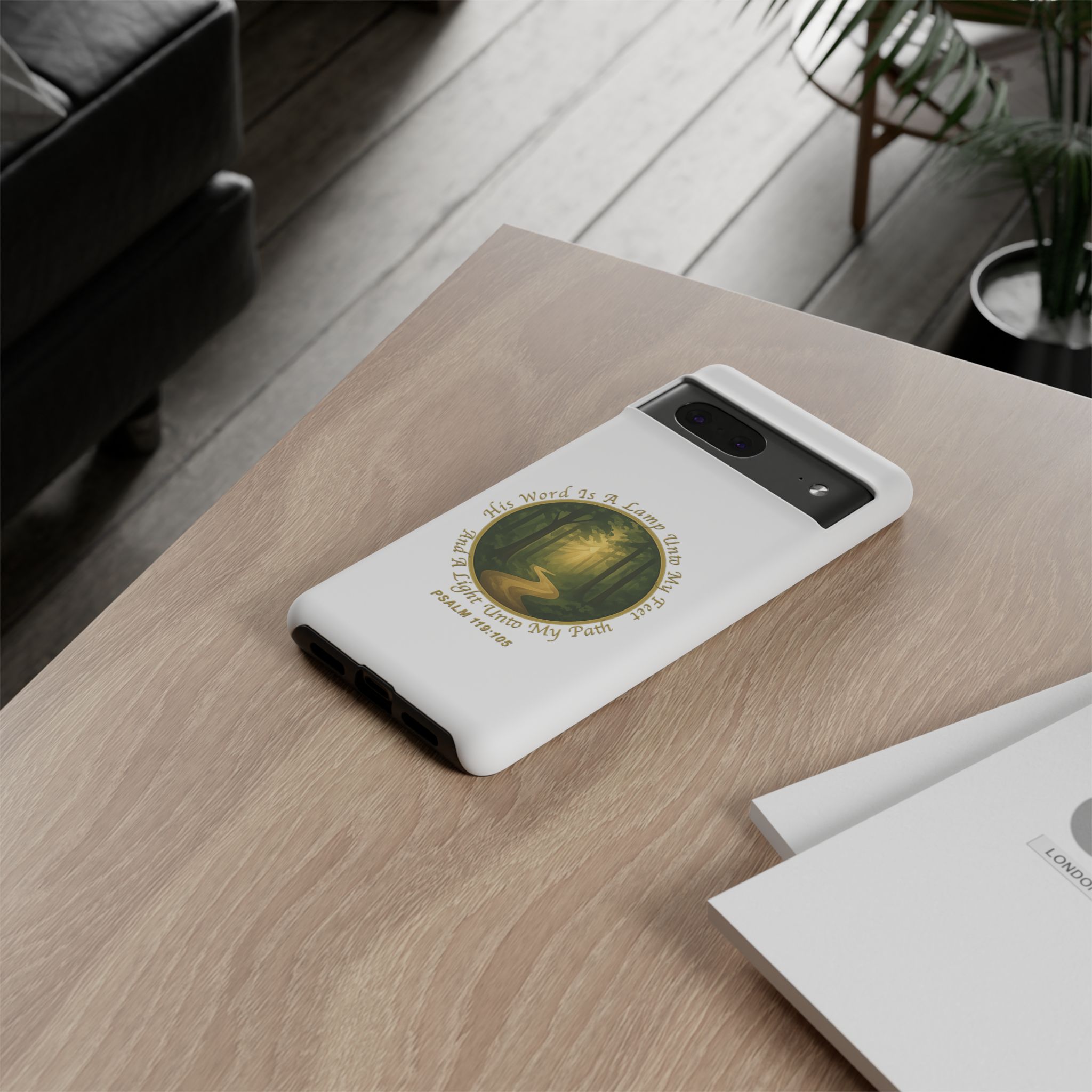 A protective phone case that feels like a whispered promise on the palm of your hand. The design centers on a sunlit forest path within a soft circular frame, paired with the comforting verse “His word is a lamp unto my feet and a light unto my path — Psalm 119:105.” The imagery and tone invite quiet reflection during a rushed day, turning your device into a small, steady reminder of guidance and peace. The slim dual-layer construction keeps the phone safe from drops while the silicone liner cushions impact. Choose glossy or matte finishes to match your daily look — both keep the print vivid and the ports accessible. For those who carry faith as quietly as a pocket companion, this case adds both protection and purpose to everyday life.