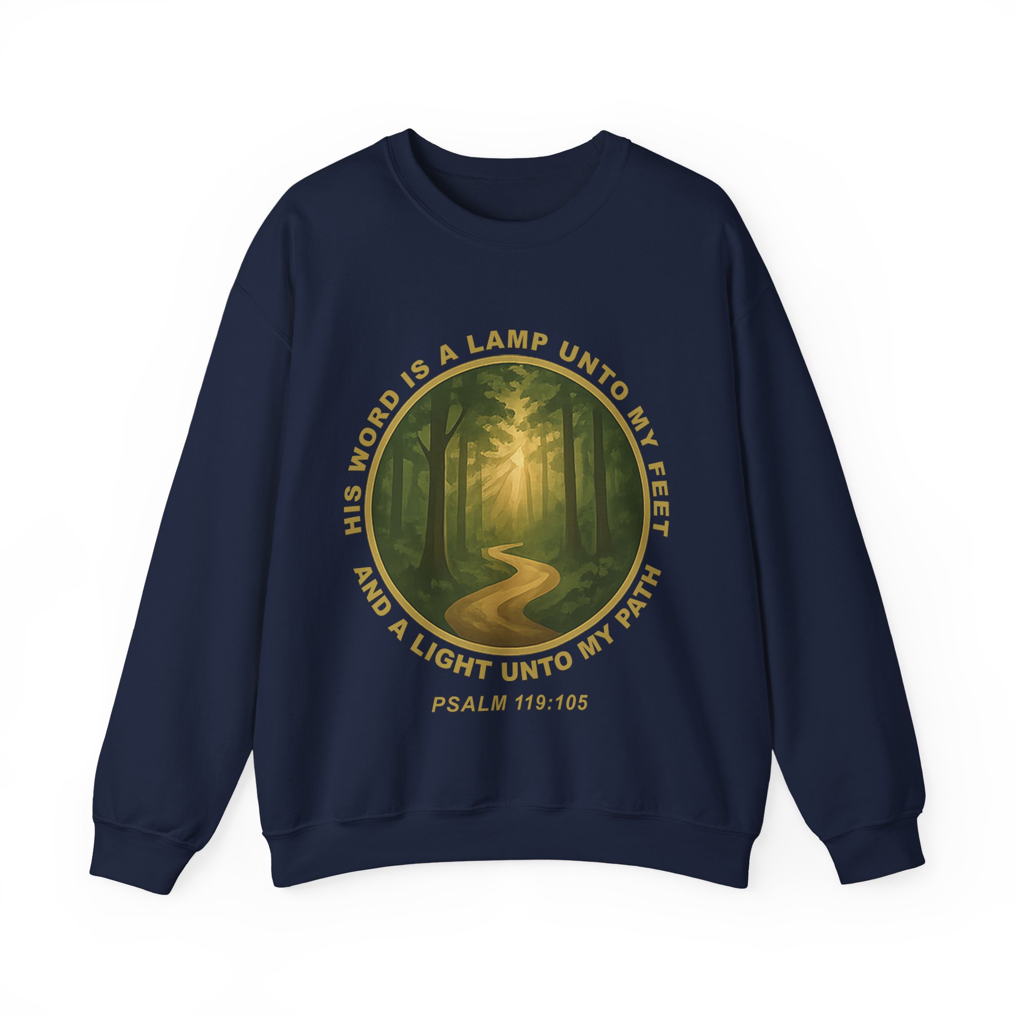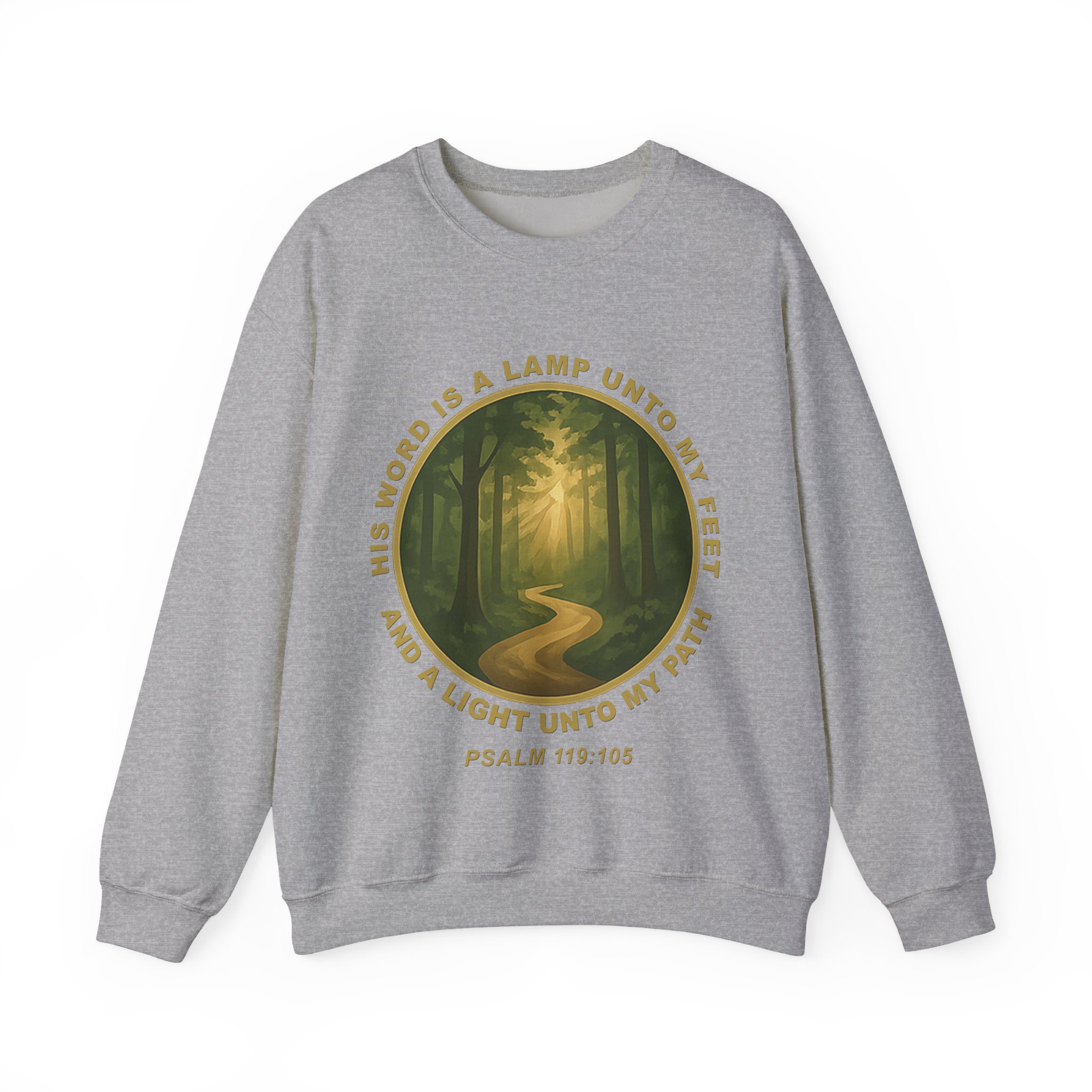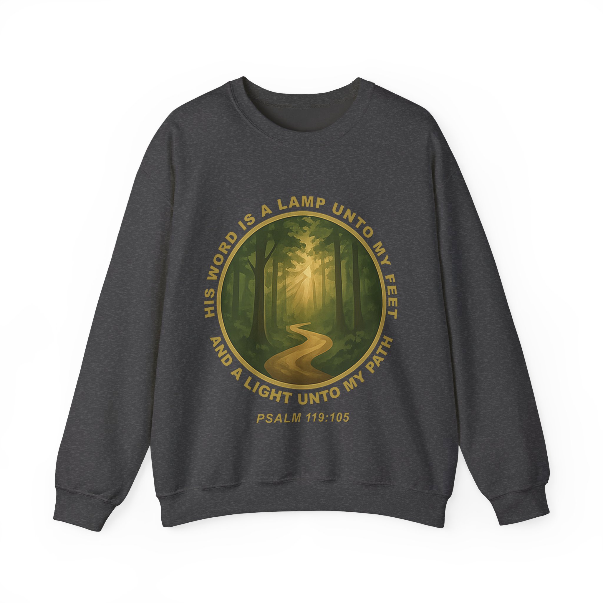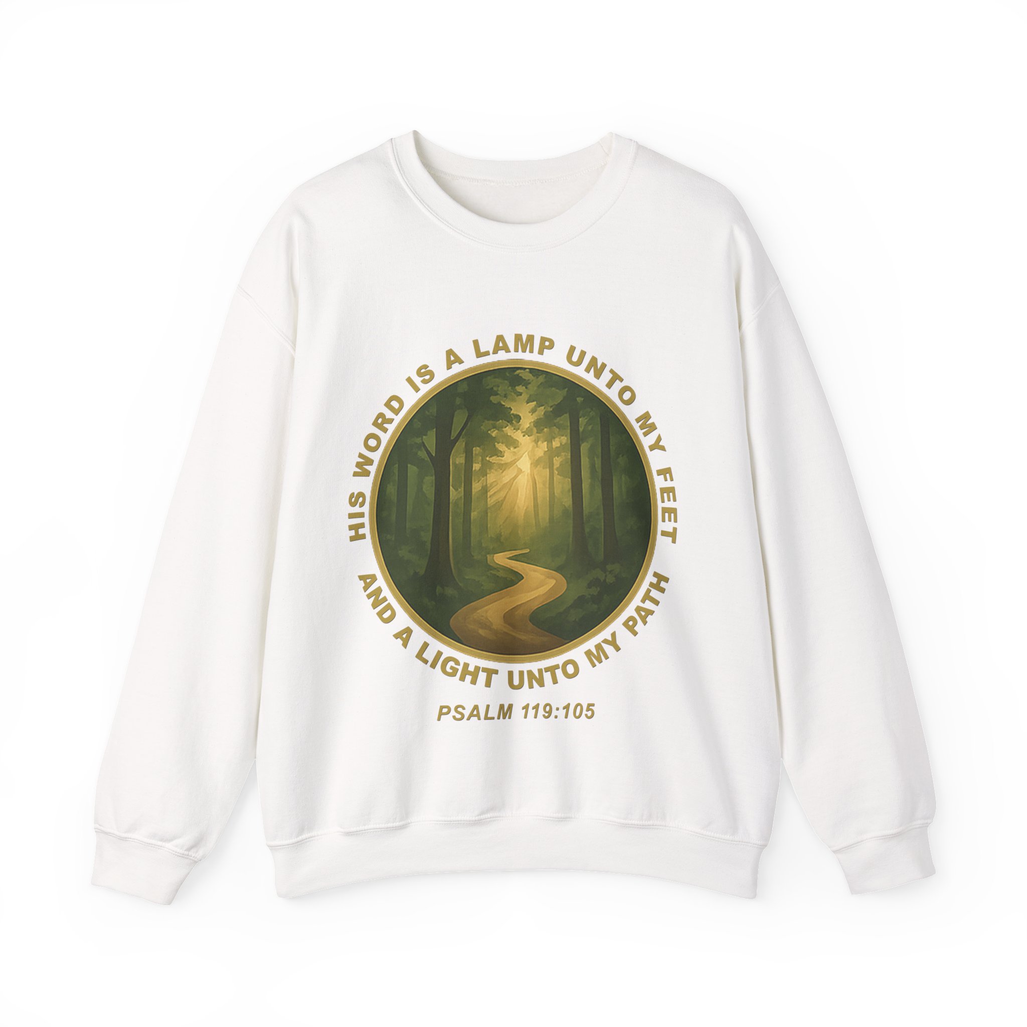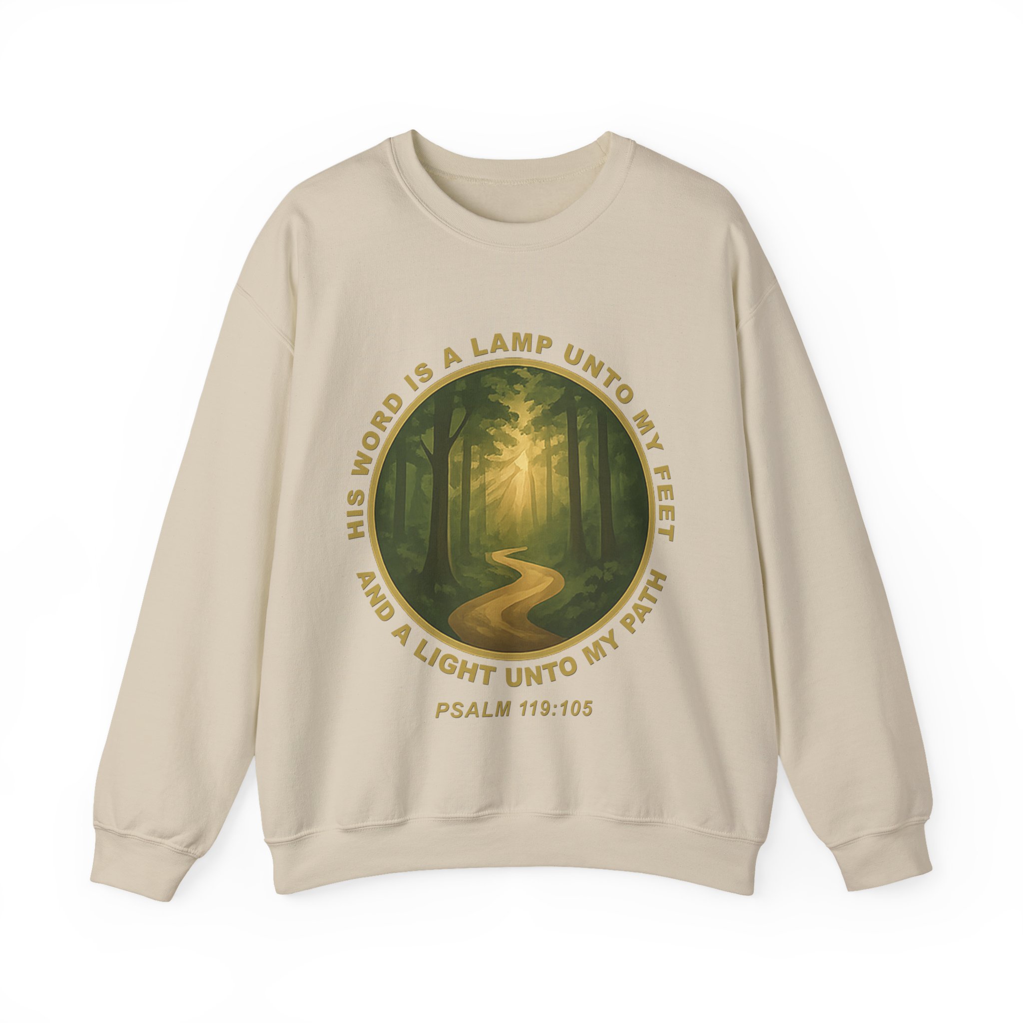Soft, warm, and quietly hopeful — this crewneck wraps you in a calm woodland scene and a familiar promise. A winding path through sun-dappled pines sits inside a circular frame, surrounded by the comforting words of Psalm 119:105. The art reads like a small chapel on your chest: reflective, steady, and made for slow mornings, evening walks, or settling in with a favorite book. The medium-heavy cotton-poly blend and classic crew cut keep the fit relaxed without losing shape. Wear it when you want calm that’s honest and simple — a gentle reminder to keep moving forward, one step at a time. Product features – Medium-heavy 50/50 cotton-poly blend (8.0 oz/yd²) for warmth and durability – Classic crewneck with double-needle stitching for long-lasting shape – Tubular knit (no side seams) for a smooth, waste-reducing construction – Embroidery and print placement options; DTF inner neck labels and DTG prints for quality detail – OEKO-TEX certified dyes, US Cotton Trust Protocol cotton, and safety compliance Care instructions – Machine wash: cold (max 30C or 90F) – Non-chlorine: bleach as needed – Tumble dry: low heat – Do not iron – Do not dryclean
