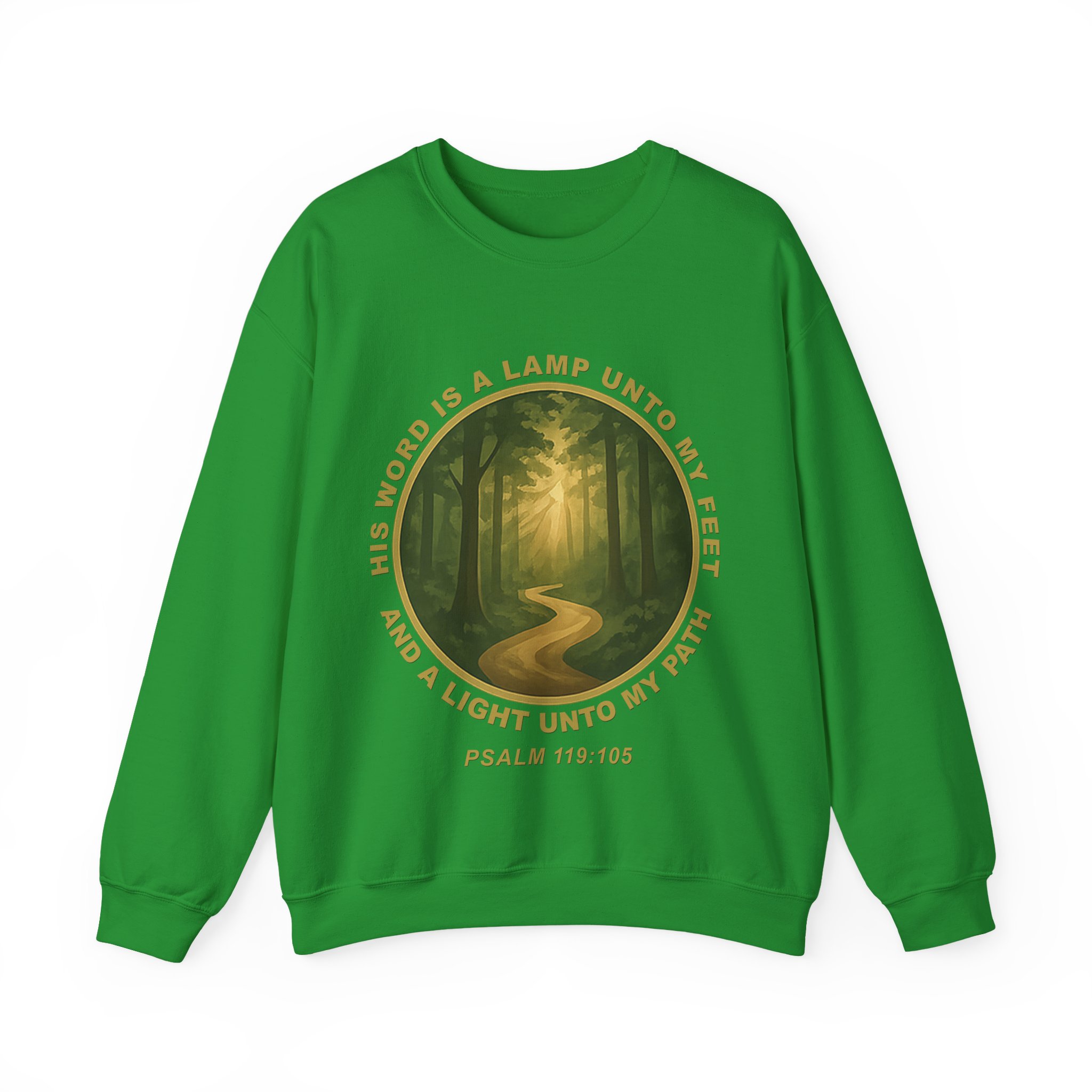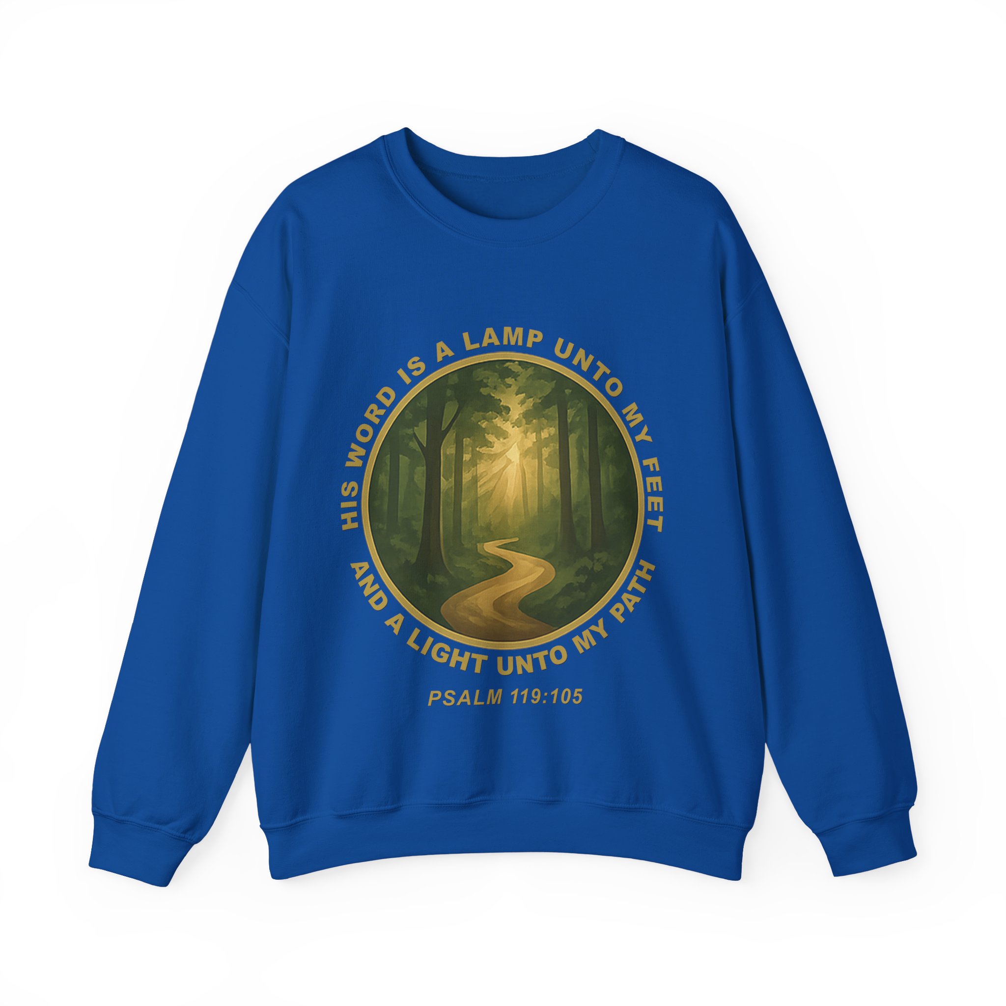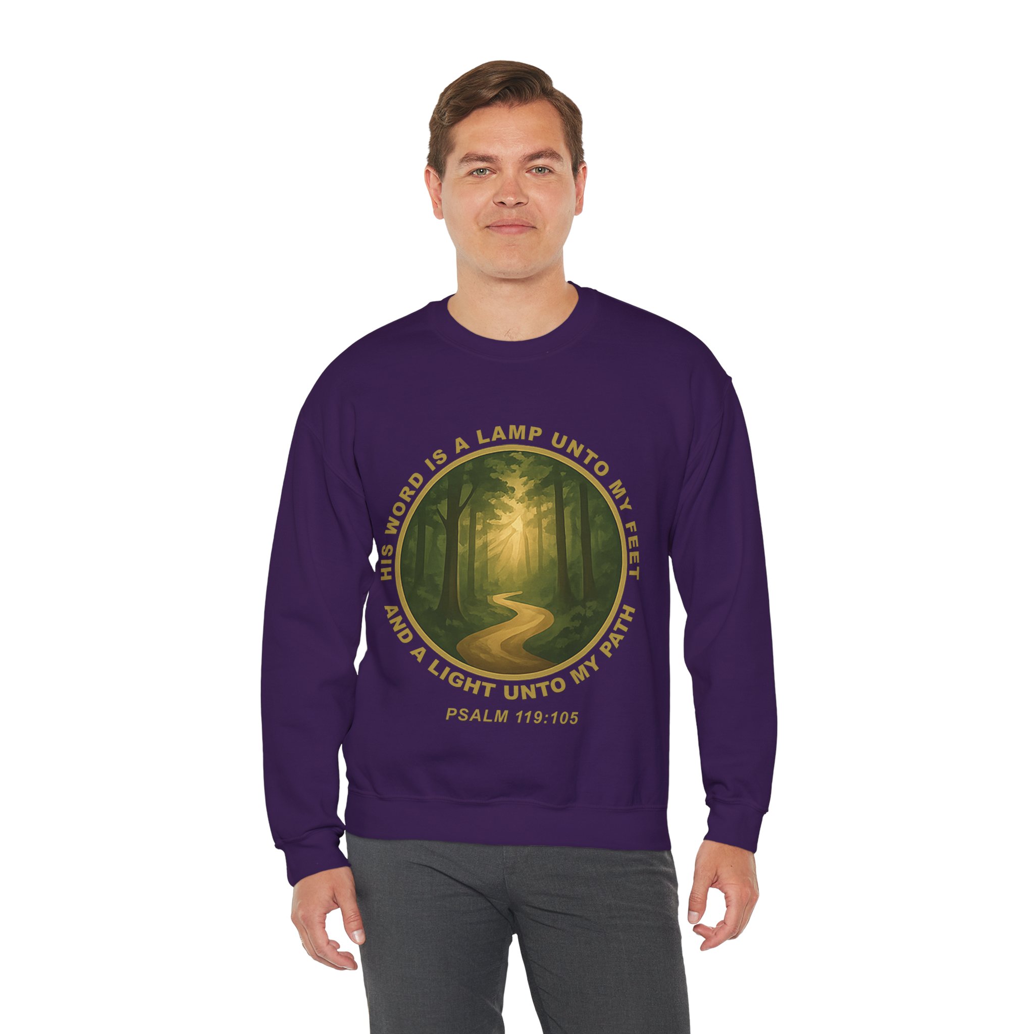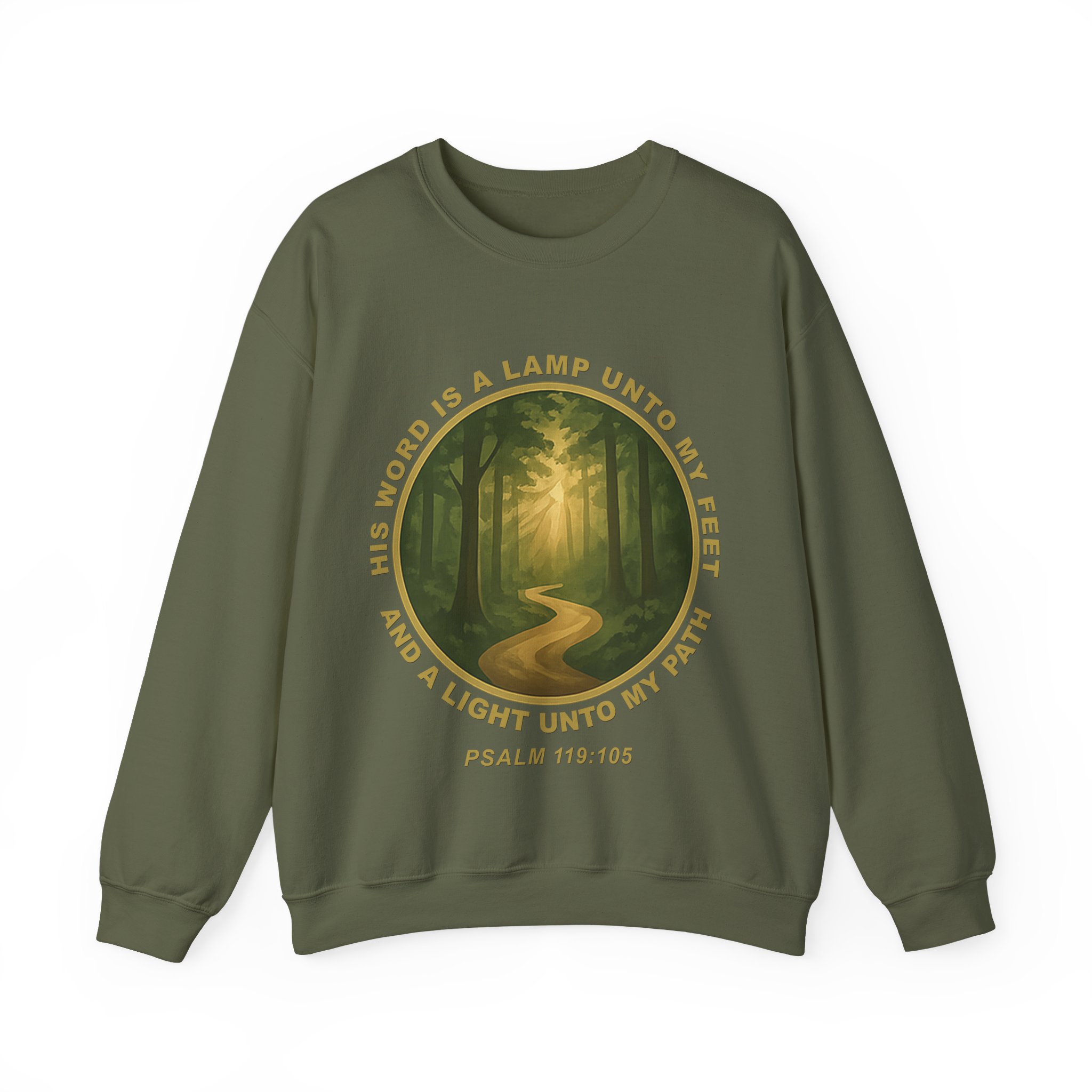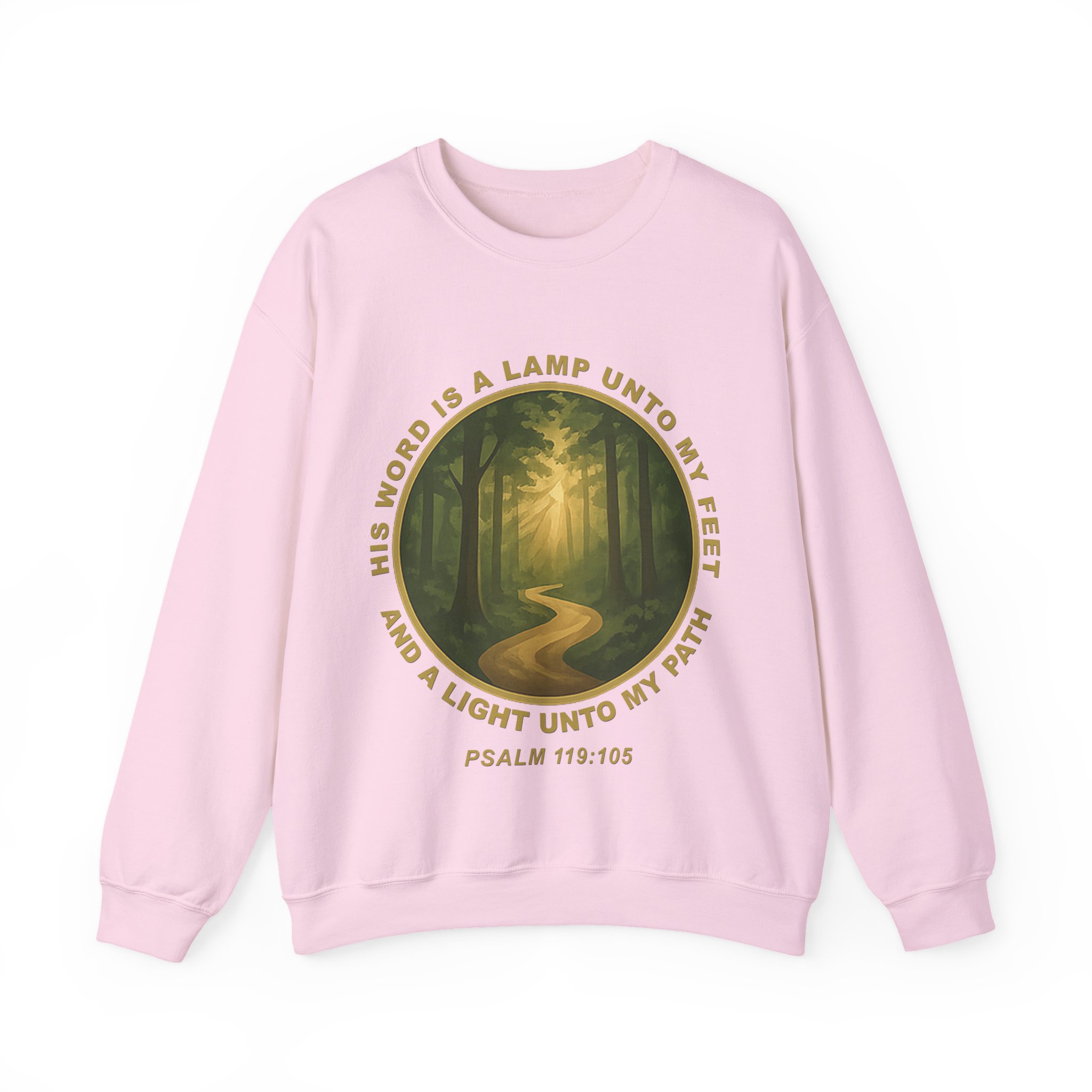 Soft, warm, and quietly hopeful — this crewneck wraps you in a calm woodland scene and a familiar promise. A winding path through sun-dappled pines sits inside a circular frame, surrounded by the comforting words of Psalm 119:105. The art reads like a small chapel on your chest: reflective, steady, and made for slow mornings, evening walks, or settling in with a favorite book. The medium-heavy cotton-poly blend and classic crew cut keep the fit relaxed without losing shape. Wear it when you want calm that’s honest and simple — a gentle reminder to keep moving forward, one step at a time. Product features – Medium-heavy 50/50 cotton-poly blend (8.0 oz/yd²) for warmth and durability – Classic crewneck with double-needle stitching for long-lasting shape – Tubular knit (no side seams) for a smooth, waste-reducing construction – Embroidery and print placement options; DTF inner neck labels and DTG prints for quality detail – OEKO-TEX certified dyes, US Cotton Trust Protocol cotton, and safety compliance Care instructions – Machine wash: cold (max 30C or 90F) – Non-chlorine: bleach as needed – Tumble dry: low heat – Do not iron – Do not dryclean